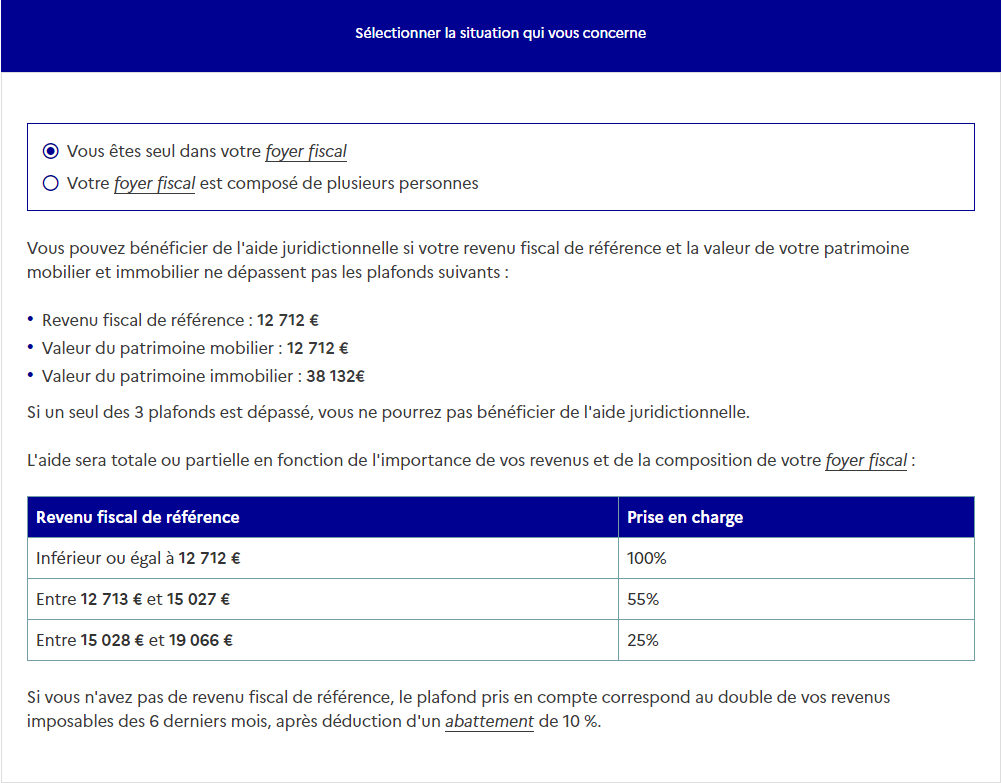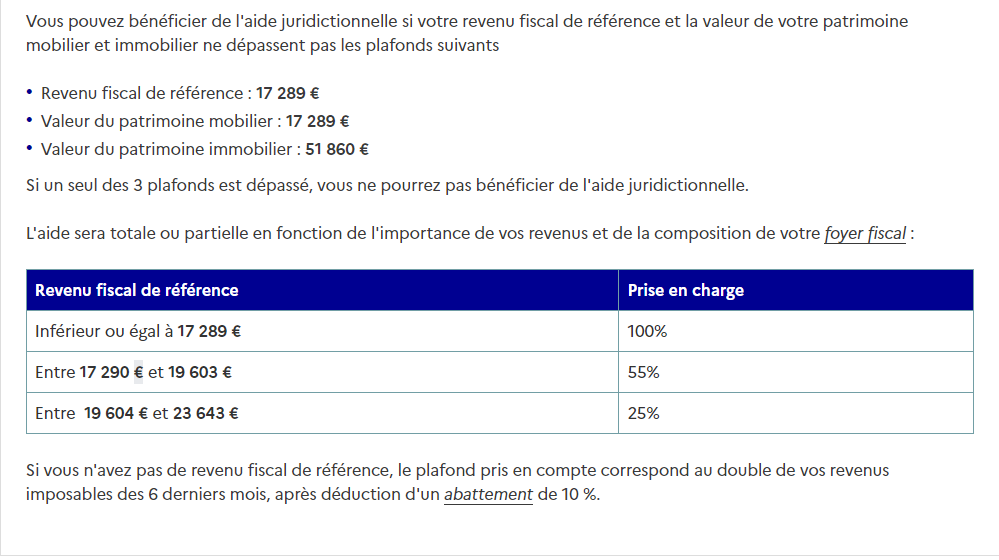 - soit vous faites une demande en ligne sur le site: https://www.aidejuridictionnelle.justice.fr/. Cela nécessite toutefois de se connecter avec FranceConnect.