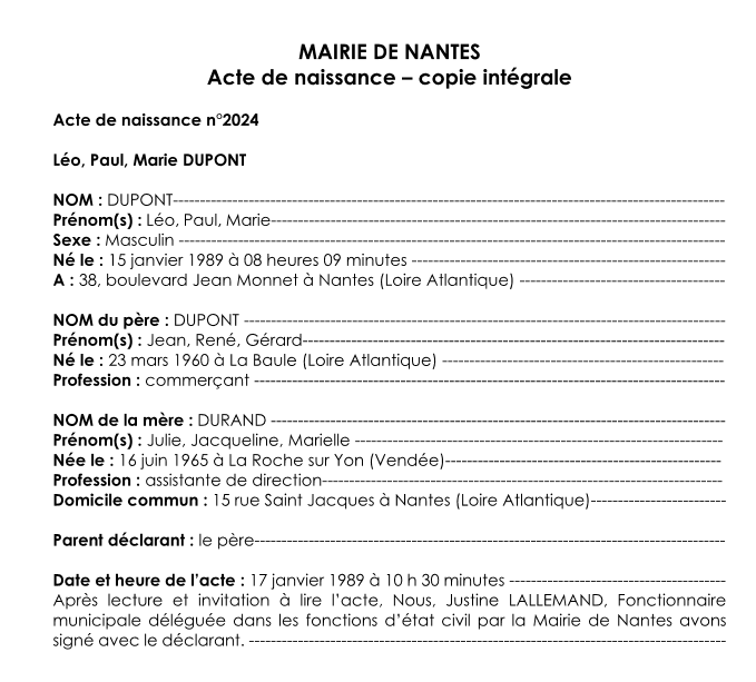 Voici à quoi ressemble un acte de naissance (celui-ci étant factice) :
